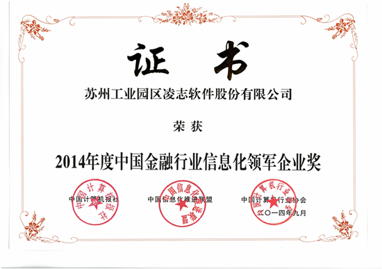 蘇州工業(yè)園區(qū)凌志軟件股份有限公司(簡稱“凌志軟件”)憑借其在金融行業(yè)中卓越創(chuàng)新力和行業(yè)引導(dǎo)力,榮獲“2014年度中國金融行業(yè)信息化領(lǐng)軍企業(yè)獎” 。