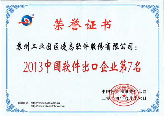 2014年6月16日,中國(guó)軟件和服務(wù)外包網(wǎng)(http://www.csso.com.cn)公布了2013中國(guó)軟件出口和服務(wù)外包排行榜入選單位和人物。凌志軟件憑借在軟件外包上取得的新成績(jī),獲得“2013年中國(guó)軟件出口企業(yè)第7名”。