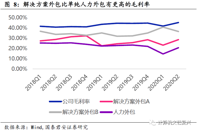 名為外包,實(shí)則解決方案輸出。我們?cè)?0月22日發(fā)布的的報(bào)告《軟件服務(wù)也可以是一門好生意》中詳細(xì)闡述了三種外包模式(人力外包、單環(huán)節(jié)外包、解決方案外包)的區(qū)別。單純?nèi)肆ν獍桓兜膬H僅是人頭,客戶檢查的是所購(gòu)買勞動(dòng)力的考勤記錄。而解決方案外包,軟件服務(wù)公司交付的是系統(tǒng)而非勞動(dòng)力,只不過這個(gè)系統(tǒng)的定價(jià)是由社會(huì)平均勞動(dòng)量決定的。在這種情況下,軟件服務(wù)公司若能高效完成任務(wù),其實(shí)不需要投入合同中規(guī)定的人力,因此有效率提升的可能。因此大多數(shù)的解決方案外包毛利率是要高于單純?nèi)肆ν獍?,而目前來看,凌志基本所有的?xiàng)目,都是解決方案外包。