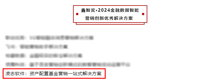 本次評選匯聚了來自銀行、證券、保險等金融機構(gòu)和企業(yè)的28位權(quán)威評審專家,經(jīng)過層層篩選和嚴(yán)格評審,凌志軟件 “資產(chǎn)配置基金營銷一站式解決方案”憑借出色的創(chuàng)新性和實用性,榮獲“鑫智獎·金融數(shù)據(jù)智能營銷創(chuàng)新優(yōu)秀解決方案”殊榮。