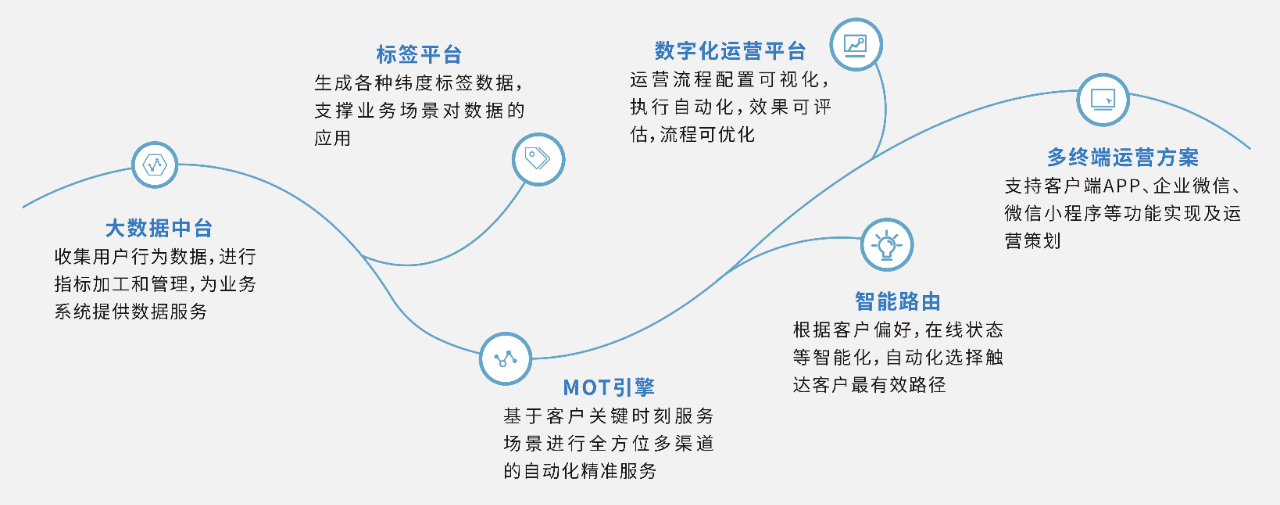 公司圍繞“場景+數(shù)據(jù)+算法”,集成凌志大數(shù)據(jù)中臺、標(biāo)簽平臺(DMP)、MOT引擎、數(shù)字化運(yùn)營平臺、智能路由、多終端運(yùn)營方案,幫助券商實(shí)現(xiàn)新的營銷和服務(wù)模式,促進(jìn)數(shù)字化轉(zhuǎn)型。