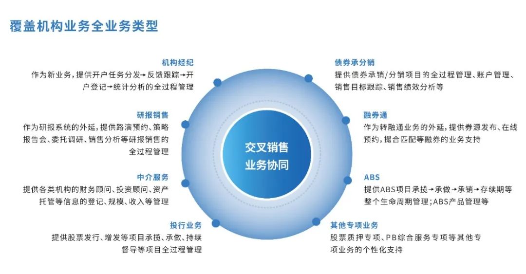 金控集團(tuán)CRM,以數(shù)據(jù)為驅(qū)動,整合公司內(nèi)外部客戶資源,關(guān)聯(lián)內(nèi)部業(yè)務(wù)數(shù)據(jù)、團(tuán)隊(duì)數(shù)據(jù);打造集中管理、資源共享型綜合服務(wù)平臺,通過統(tǒng)計(jì)分析、深挖各類機(jī)構(gòu)客戶的價值,實(shí)現(xiàn)業(yè)務(wù)即時推送,支撐券商向綜合金融服務(wù)戰(zhàn)略的轉(zhuǎn)型。該產(chǎn)品覆蓋了機(jī)構(gòu)業(yè)務(wù)全業(yè)務(wù)類型,包括:機(jī)構(gòu)經(jīng)紀(jì)業(yè)務(wù)、研報銷售、中介服務(wù)、投行業(yè)務(wù)、債券承分銷、融券通、ABS、以及其他專項(xiàng)業(yè)務(wù)。