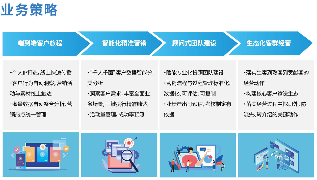 公司聚焦于券商爭搶財(cái)富管理轉(zhuǎn)型的機(jī)遇期,組建財(cái)富管理業(yè)務(wù)轉(zhuǎn)型咨詢團(tuán)隊(duì),以基金投顧為抓手,確定財(cái)富管理業(yè)務(wù)轉(zhuǎn)型的目標(biāo)、對策、實(shí)現(xiàn)方法;對標(biāo)國內(nèi)外最佳實(shí)踐,從橫向的財(cái)富管理業(yè)務(wù)發(fā)展和縱向的業(yè)務(wù)流程、人員架構(gòu)、技術(shù)工具的三位一體,明確課題對策并提供具體落地實(shí)施舉措。